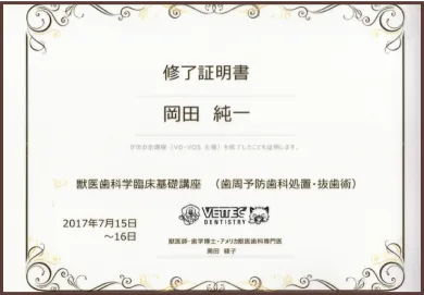 - 日本大学大学院 獣医学研究科所属、日本顕微鏡歯科学会、日本小動物歯科研究会、日本獣医歯科学会、日本顕微鏡歯科学会