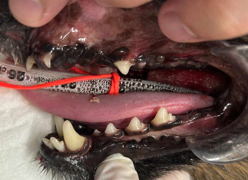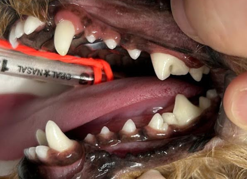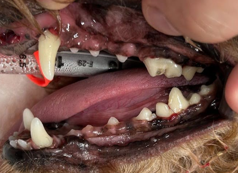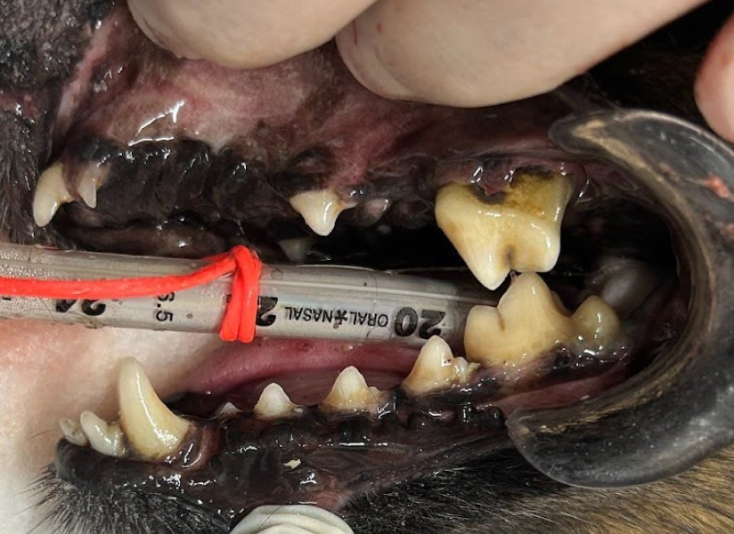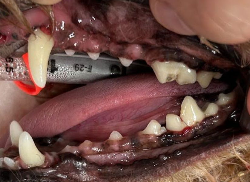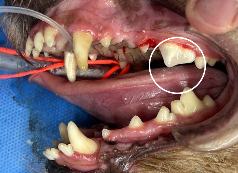 歯周病で歯が抜けたため来院されました。マスクをしていても強い口臭が感じられ、重度の歯周病が疑われます。歯の温存を希望されていたので、まずは歯科レントゲンを使って全身麻酔での精査と歯石除去・歯周病の治療を行うことになりました。また、神経が露出している歯があったので、抜髄根管治療も実施しました。