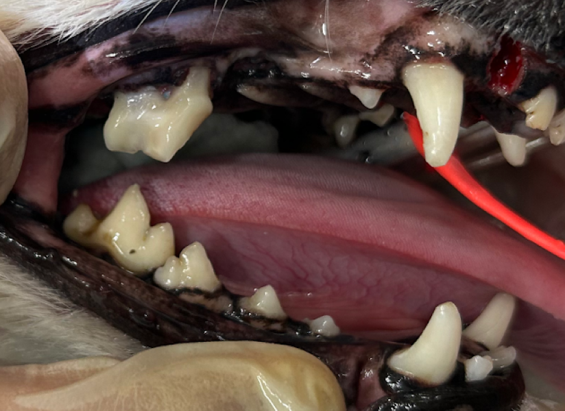左上の奥歯は歯根が見えていて、下の奥歯も歯ぐきが下がっています。全体的に歯石が付着して歯肉の炎症が起きています。くしゃみが続いているとのお話しがあったので、口腔鼻腔瘻の可能性があります。当院では歯を残すことを大切に処置を行なっていますが、一般的には口腔鼻腔瘻がある場合は抜歯適応になります。