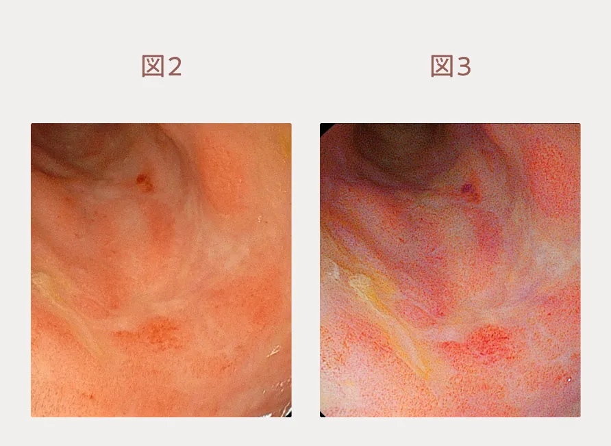 (図2)内視鏡カメラの特殊光を病変部に当てると敷石状に不整な隆起が赤く照らされ、明らかに異常な様子が観察されました。(図3)小腸は全体的に浮腫を認め、回腸では軽度のリンパ管拡張所見を認めました。内視鏡生検の病理結果で「結腸の中細胞リンパ腫、中程度の慢性胃腸炎と軽度のリンパ管拡張症」と診断されました。