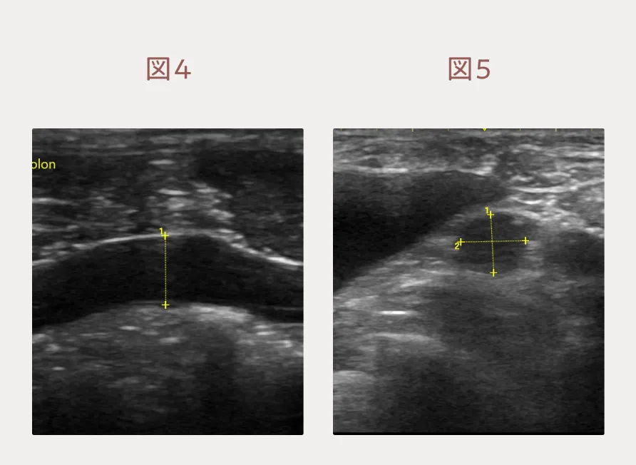 ご家族は抗がん剤治療を希望されましたので、週1回の抗がん剤治療を開始しました。抗がん剤の投与当日には病変が増悪しており、エコー検査で大腸の一部は大腸壁の肥厚・層構造の消失・結腸リンパ節腫大を認めました。(図4、5)この患者さんのリンパ腫は細胞形態的には悪性度としては中間ですが、高悪性度寄りのリンパ腫である可能性があります。