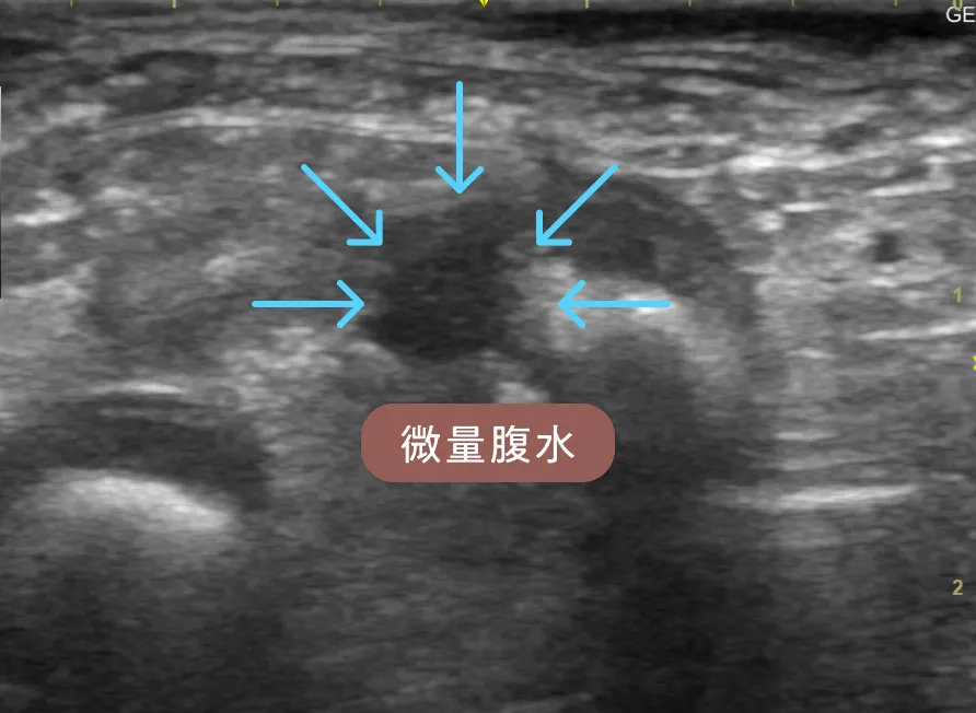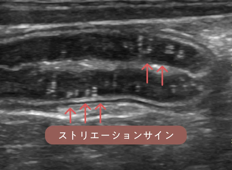 身体検査では軽度の削痩を認めました。血液検査では低アルブミン血症(2.1 g/dl)を認めました。エコー検査では小腸の広範囲でリンパ管拡張を示す白い縦縞のストリエーションサイン(正常な腸には見られない、エコーで映る縞模様 _ 赤矢印)と微量腹水(青矢印)が見られました。