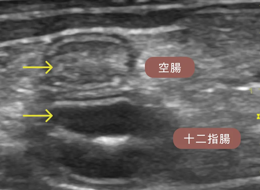 ストリエーションサインは特に空腸で重度にみられ、隣に描出した十二指腸の粘膜層(黒く分厚い層)と比較してかなり白く見えます(黄矢印)。各検査から可能性のある病気を除外し、蛋白漏出性腸症を強く疑いました。全身状態も悪くないため、ご家族と相談し、内視鏡検査を行う前にまずは食事療法の反応性を確認します。