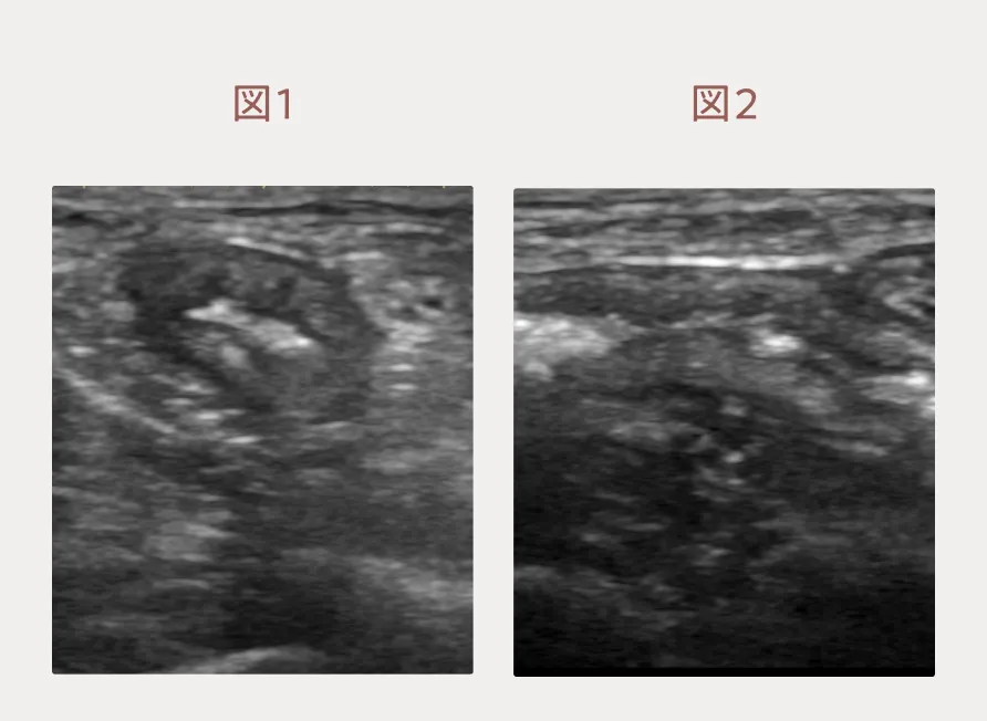 血液検査では特筆すべき異常所見はありません。一方、エコー検査では大腸の短さと大腸壁の肥厚(特に粘膜下織の肥厚)を感じました(図1:短軸、図2:長軸)。小腸も腸壁の肥厚があり、短結腸症候群とびまん性胃腸疾患(慢性腸炎やリンパ腫など)の併発を疑い、内視鏡検査を推奨しました。