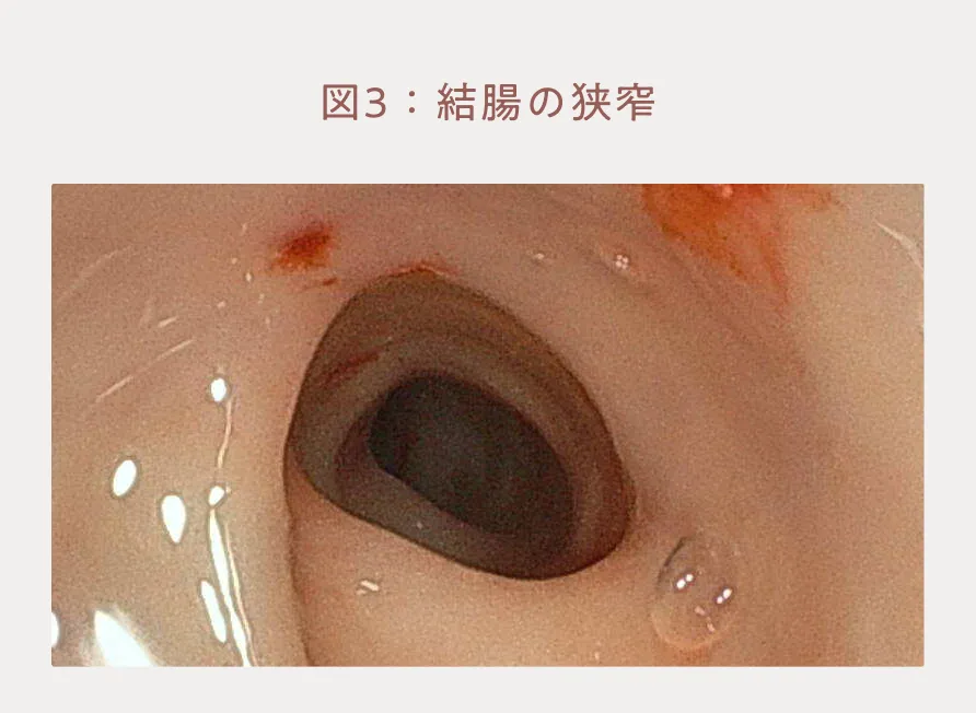 糞便のPCR検査ではトリコモナスは陰性でした。内視鏡検査では20-25cmほどあるべき結腸が14cmと短く、肛門から10-12cmの領域は内視鏡で送気しても内腔が十分に拡張せずにやや狭窄していました(図3)。