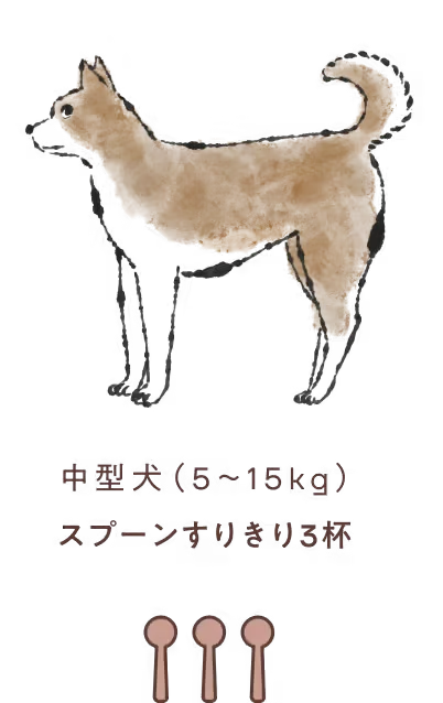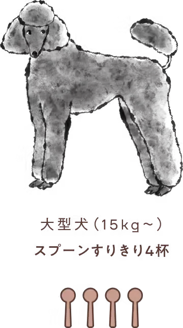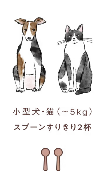 付属スプーンにて1日あたり下記を目安に与えてください。 小型犬・猫:すりきり2杯 中型犬・猫:すりきり3杯 大型犬:すりきり4杯